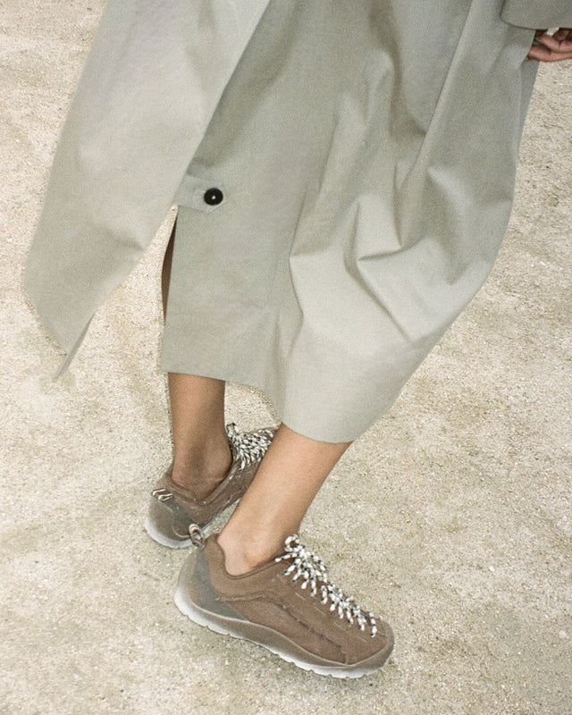 Pelle scamosciata, allacciatura ispirata all’arrampicata e suola a presa sicura: ogni dettaglio racconta libertà di movimento e autenticità.